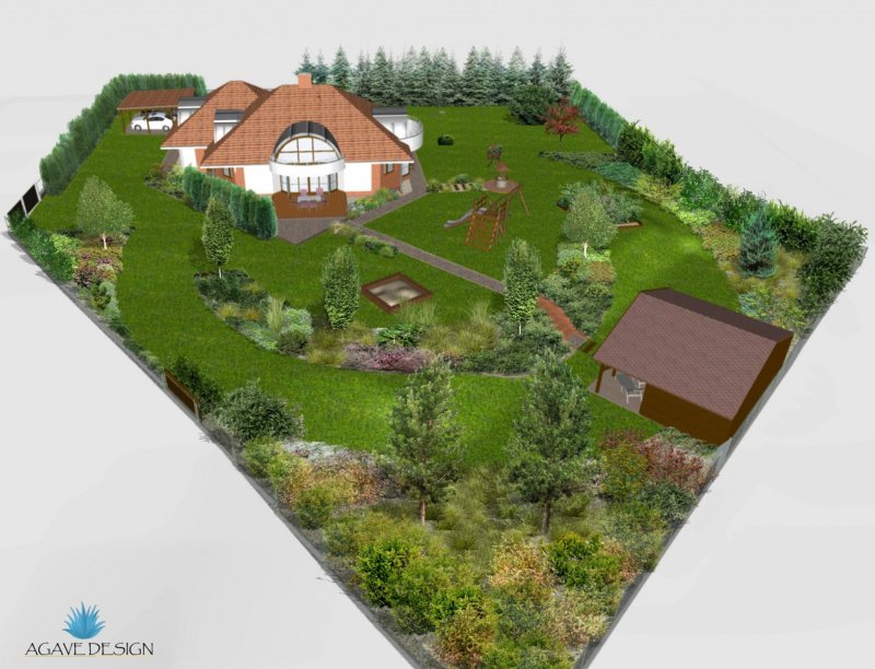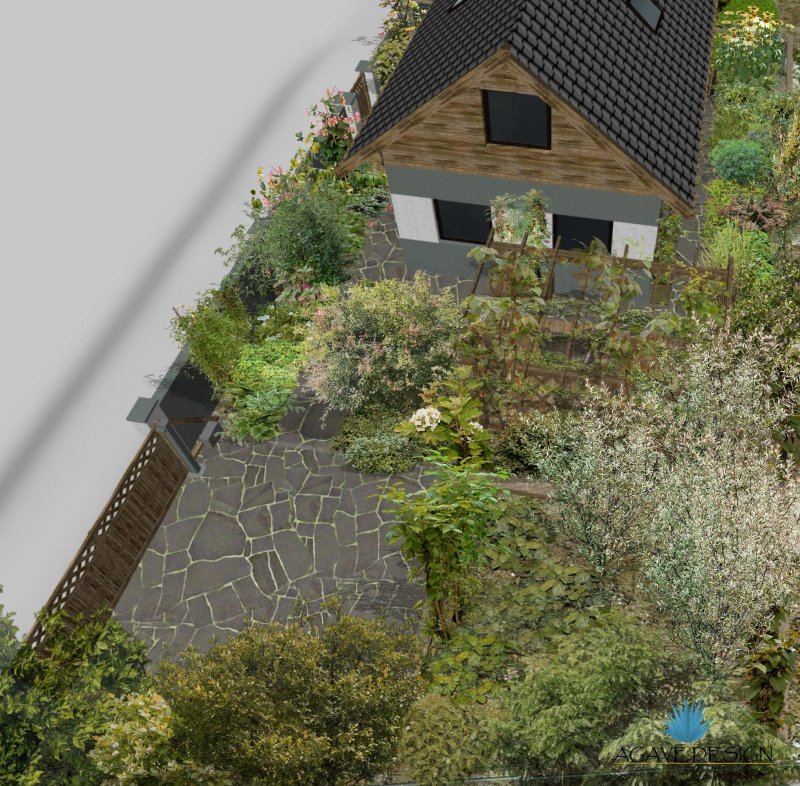 Zahrada v Zelenči - tradiční dvůr vzadu, okrasná část vpředu, její součástí je náznak ovocného sadu