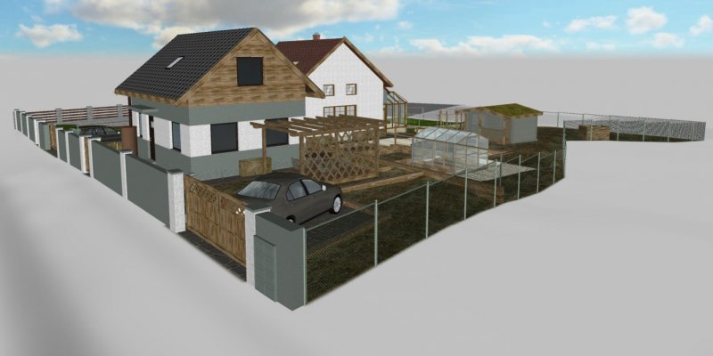 1. fáze procesu tvorby vizualizací - uspořádání ploch, terén, stavby (projekt Doubravčice)